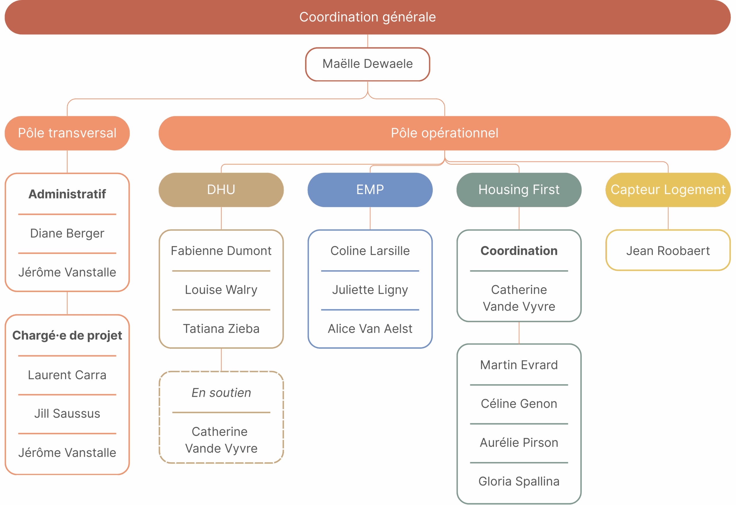 L’équipe du RSBW s’organise autour d’une coordination générale, assurée par Maëlle Dewaele, et repose sur une structure articulée en deux pôles complémentaires : un pôle transversal et un pôle opérationnel. Le pôle transversal regroupe les fonctions administratives et de gestion de projets, garantes du bon fonctionnement et du soutien aux actions menées par le réseau. Le pôle opérationnel rassemble les équipes engagées sur le terrain au sein des différents dispositifs et projets, notamment le Dispositif d’hébergement d’urgence (DHU), l’Équipe Mobile Précarité (EMP), le Housing First et le Capteur Logement. Cette organisation permet de conjuguer expertise, coordination et proximité avec les réalités de terrain, au service des missions du RSBW et de ses partenaires.